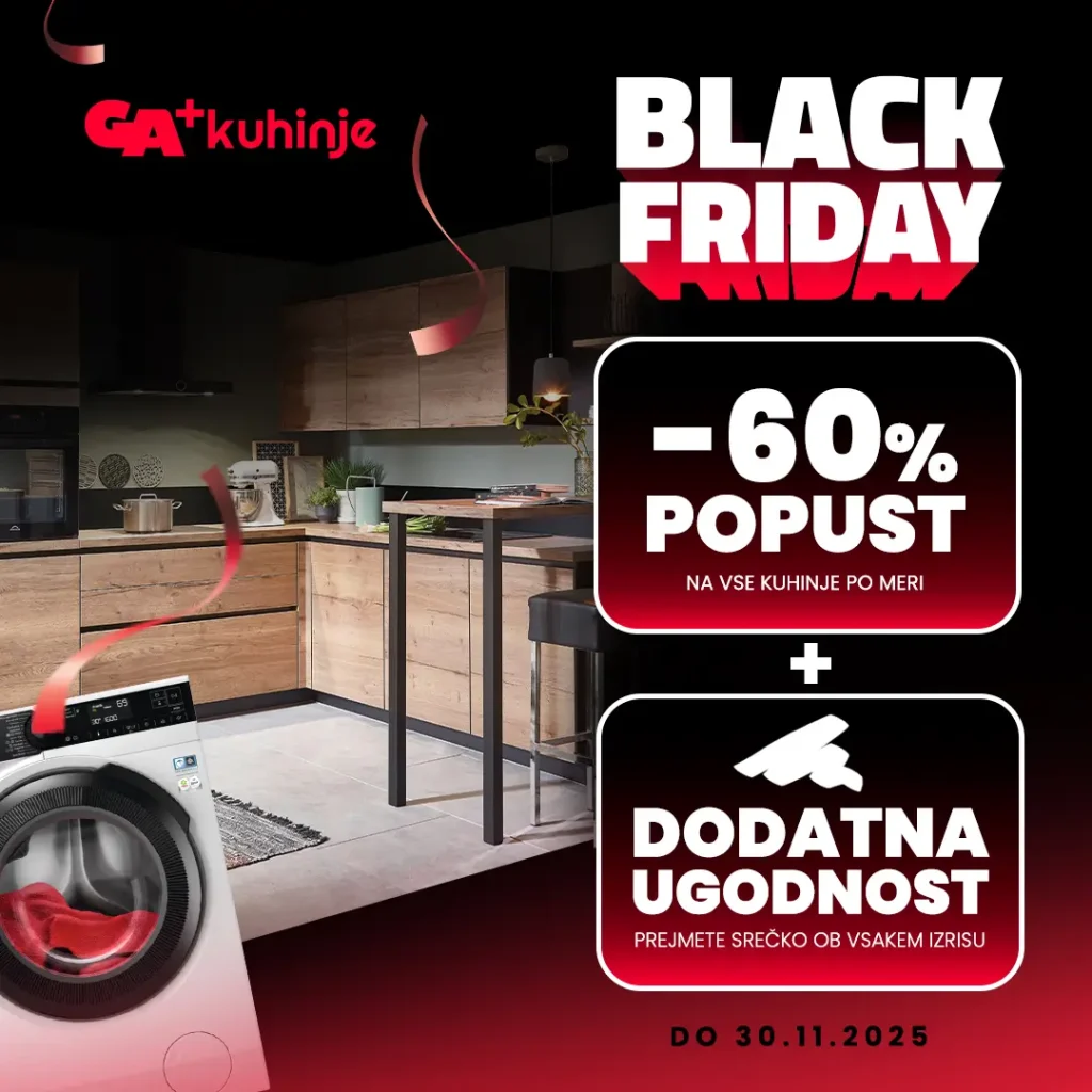 Akcija »50 % znižanje cen kuhinj + Leanpay OM 0 % do 48 obrokov + Paket brez skrbi« velja za naročila, oddana med 21. 10. in 31. 12. 2025 v salonih GA+ kuhinje ali ob izrisu na domu. V okviru akcije se priznava 50 % popust na redno ceno lesenega dela kuhinj in drugega pohištva, naročenega v navedenem obdobju. Stranka lahko ob tem izkoristi posebno ponudbo brezobrestnega kredita Leanpay OM 0 % do 48 obrokov, pri čemer znaša strošek odobritve kredita 399 €. Akcija se ne sešteva z drugimi akcijami ali popusti, razen če je navedeno drugače, ter ne velja za gospodinjske aparate in dodatno opremo. Za potrditev naročila je potrebno vplačilo najmanj 50 % avansa od končne cene lesenega dela kuhinje ali drugega pohištva. Ob nakupu lesenega dela kuhinje v vrednosti nad 2.300,00 € z že upoštevanimi popusti kupec prejme brezplačni »Paket brez skrbi«, ki vključuje 3D načrtovanje kuhinje v salonu ali na domu, izmero prostora na domu, dostavo, vnos in montažo nove kuhinje ter vnos in vgradnjo gospodinjskih aparatov, kupljenih v GA+ kuhinje, in 5 let brezskrbnosti. Brezplačne storitve ne vključujejo demontaže in odvoza stare kuhinje, priklopa gospodinjskih aparatov, predelave napeljav na obstoječi infrastrukturi, kakršnihkoli gradbenih del ali odklopa aparatov iz omrežja. Organizator si pridržuje pravico do spremembe pogojev ali predčasnega zaključka akcije, pri čemer bodo vse spremembe objavljene na uradni spletni strani GA+ kuhinje.