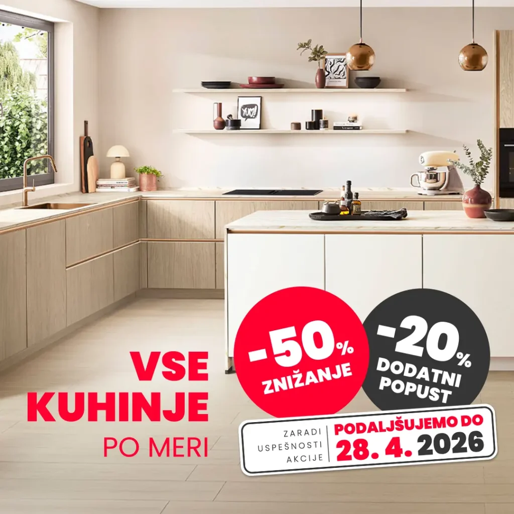 Akcija se upošteva kot 50 % popust na redno ceno lesenega dela kuhinj in ostalega pohištva, ki je bilo naročeno med 13. 4. – 28. 4. 2026 v salonih GA+kuhinje ali pri izrisu na domu; dodatnih 20% popusta velja na leseni del pohištva iz kolekcije 2026. V končnem izračunu akcija torej predstavlja 60% popust na redno ceno kuhinje ali ostalega pohištva. Iz akcije so izključeni predhodno narejeni izračuni in ponudbe ter predhodno avansirane kuhinje. Primer izračuna cene kuhinje – redna cena lesenega dela kuhinje: 10.000,00 €; 50% znižanje na redno ceno lesenega dela kuhinje: 5.000,00 €; 20% dodatno znižanje na ceno lesenega dela kuhinje, z že upoštevanim 50% popustom: 4.000,00 €. Iz izračuna so izvzeti stroški nakupa na obroke, kredita. Akcija ne velja za gospodinjske aparate in dodatno opremo. Za naročilo kuhinje je potrebno vplačilo vsaj 50% avansa končne cene lesenega dela kuhinje ali ostalega pohištva. Akcije se med seboj izključujejo, razen če je navedeno drugače. Brezplačne storitve »Paket brez skrbi« vam omogočimo ob nakupu lesenega dela kuhinje v vrednosti nad 2.300,00 € z že upoštevanimi popusti. Storitve vključujejo: 3D načrtovanje kuhinje na domu ali v salonih; izmera prostora na domu; dostava nove kuhinje; vnos in montaža nove kuhinje; vnos in vgradnja gospodinjskih aparatov, kupljenih v GA+kuhinje; 5 let brezskrbnosti. Brezplačne storitve ne vključujejo demontaže in odvoza stare kuhinje; priklopa gospodinjskih aparatov; predelave napeljav na obstoječi infrastrukturi; kakršnihkoli gradbenih del; odklopa aparatov iz omrežja (vodovodnega, plinskega, električnega). Načini plačila: gotovinsko, TRR, Maestro, BA kartice, debetne kartice in obročno odplačevanje, ki zajema kredite od 3 do 84 obrokov (do vrednosti 15.000,00 €) ter obročno odplačevanje s karticami Diners in NLB karticami.