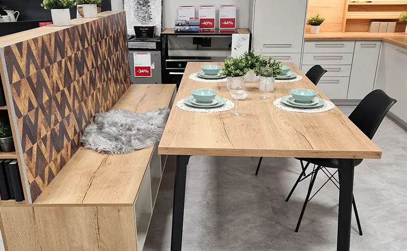 Jedilnica Noblessa Rivoli Cena: 1.699 €Salon: Ljubljana Rudnik Telefon: 01 77 70 720 Dimenzija mize: 200 cm x 90 cm Višina mize: 76 cm Dimenzija klopi: 252 cm x 67 cm Višina klopi: 122 cm Dodatna oprema: Prostorna jedilnica s klopjo. Pod klopjo ima odprte police za shranjevnje. Ob straneh ima dodatne ozke police za […]
