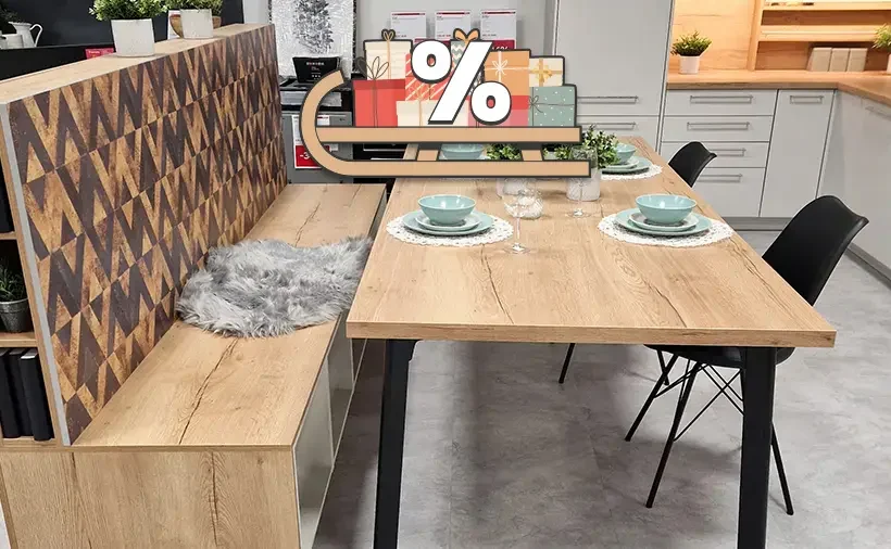 Jedilnica Noblessa Rivoli Cena: 1.699 € Salon: Ljubljana Rudnik Telefon: 01 77 70 720 Dimenzija mize: 200 cm x 90 cm Višina mize: 76 cm Dimenzija klopi: 252 cm x 67 cm Višina klopi: 122 cm Dodatna oprema: Prostorna jedilnica s klopjo. Pod klopjo ima odprte police za shranjevnje. Ob straneh ima dodatne ozke police […]
