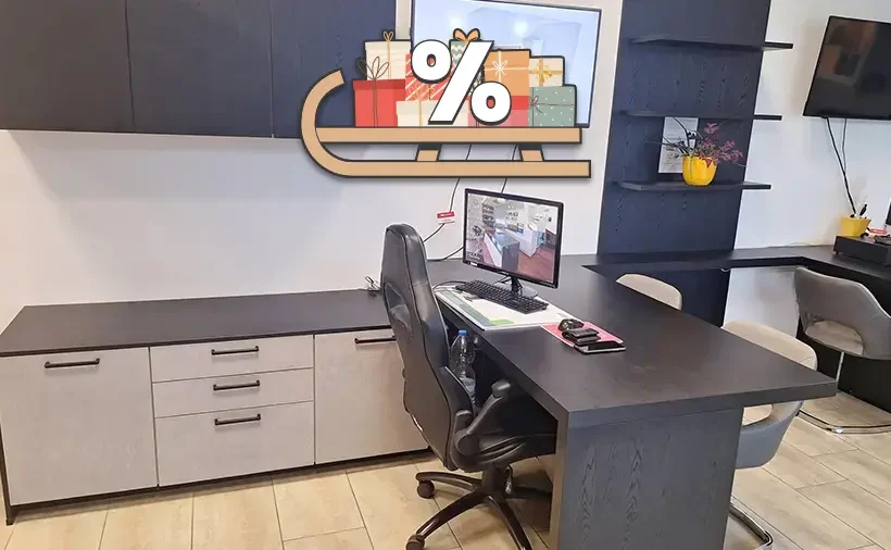 Pisarna Opus Cena: 1.399 € Salon: Novo mesto Telefon: (07) 777 44 77 Pisarna je v barvi črnega lesa v kombinaciji imitacije kamna sivi skrilavec. Sklop je sestavljen iz pisalne mize 180 cm x 90 cm, spodnjih omaric dolžine 210 cm in visečih omaric Opomba: na odprodaji je samo levi sklop pisarne (kot navedeno v […]