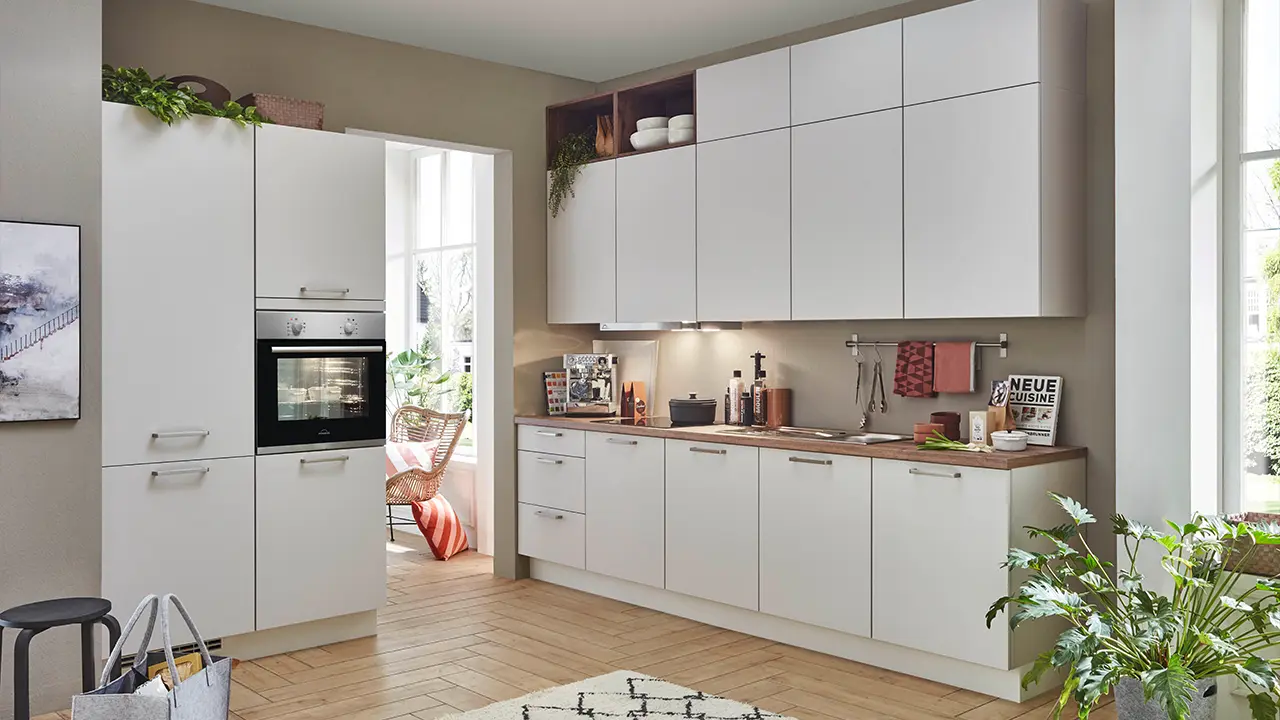 Kuhinjo zaznamujejo čiste, ravne linije in bele fronte, ki ustvarjajo urejen, sodoben videz. Delovni pult v videzu naravnega lesa prostoru doda toplino in prijeten kontrast svetlim površinam. Vgradni elementi in ravni ročaji poudarjajo minimalistično estetiko ter praktično uporabo. Kuhinja deluje zračno, funkcionalno in oblikovno uravnoteženo.