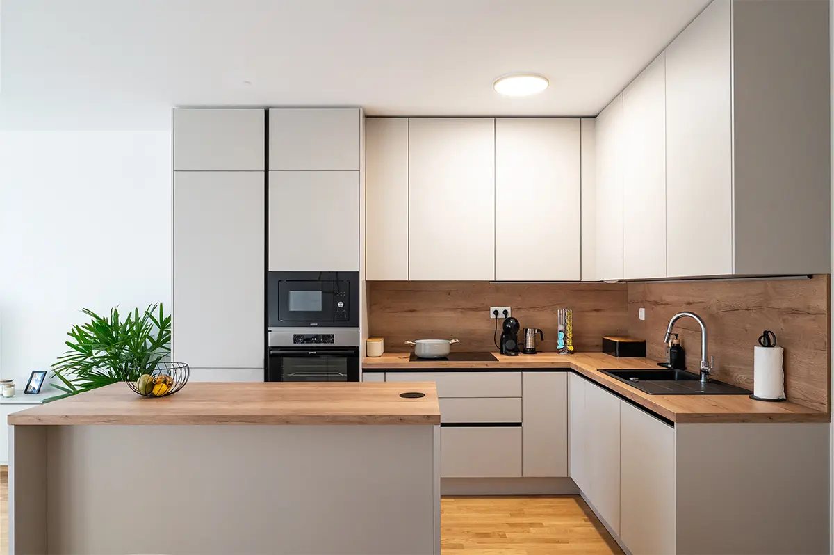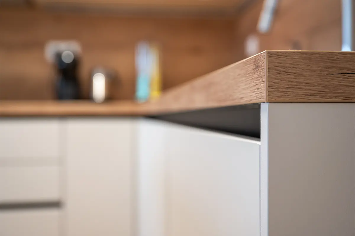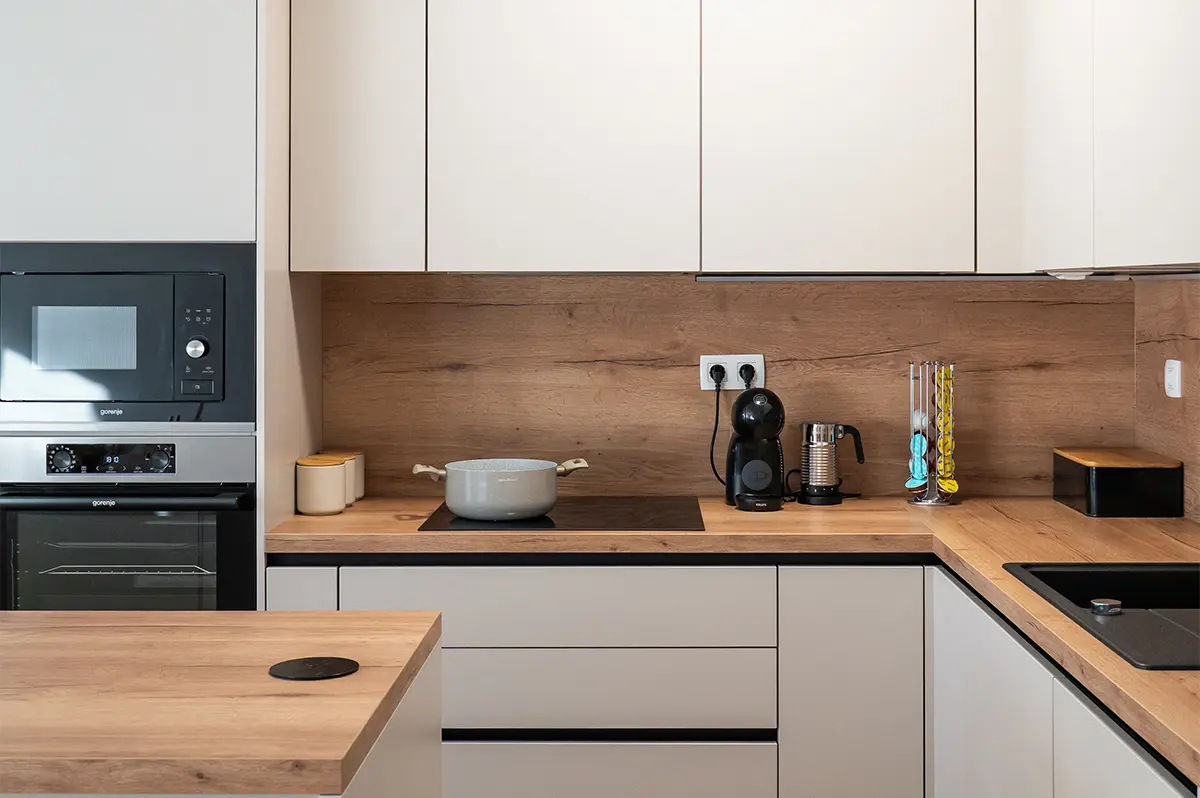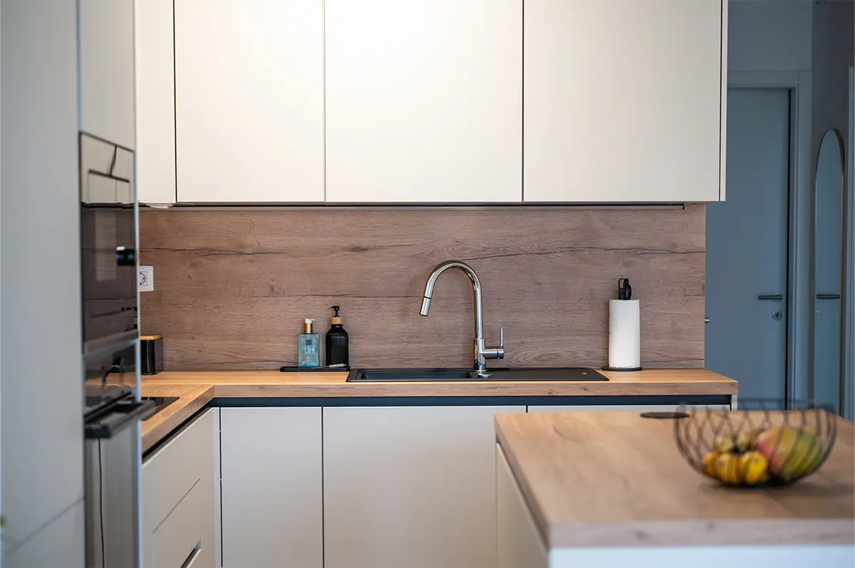 Sarino kuhinjo zaznamuje premišljena kombinacija čistih linij, toplih materialov in natančno izbranih detajlov. Mat fronte v peščeni barvi brez ročajev ustvarjajo miren, minimalističen videz, ki prostor optično poveča in deluje brezčasno. Kontrast jim daje delovna plošča in stenska obloga v videzu naravnega lesa, ki kuhinji dodata toplino in domačnost.