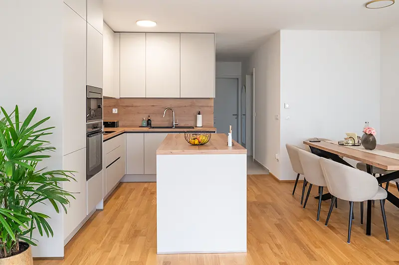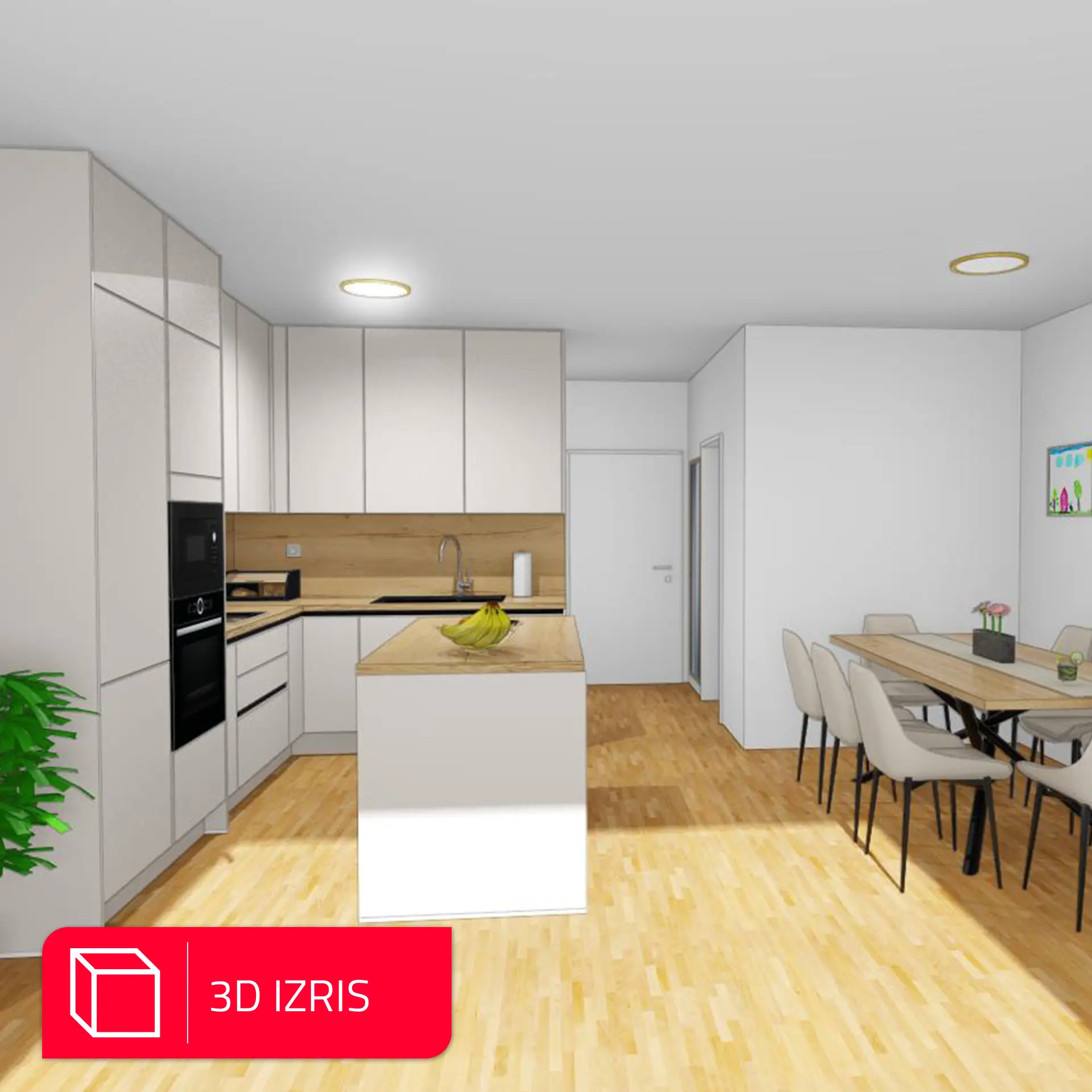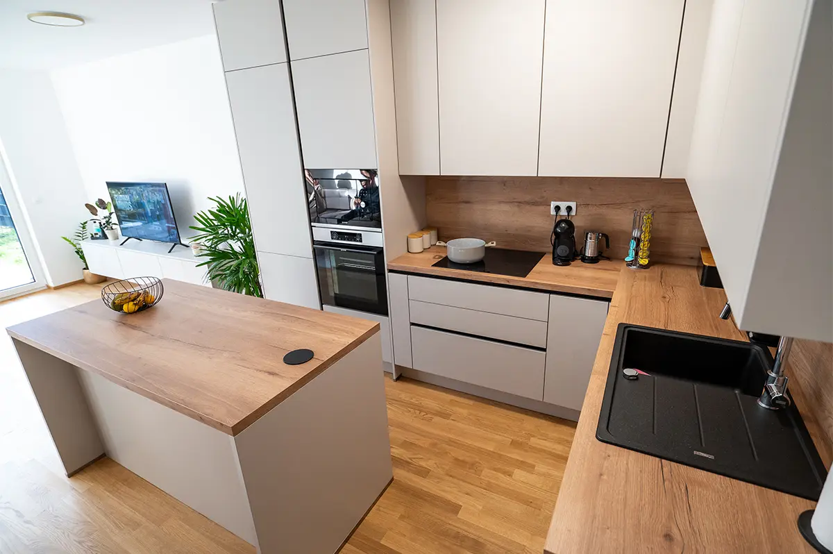 Postavitev v obliki črke L z otokom omogoča jasno ločene delovne cone ter hkrati spodbuja druženje. Otok služi kot dodatna delovna površina, prostor za hiter obrok ali sproščen pogovor, obenem pa povezuje kuhinjo z bivalnim delom doma. Vgradni aparati so diskretno umeščeni v visoke elemente in zagotavljajo ergonomijo ter urejen videz.