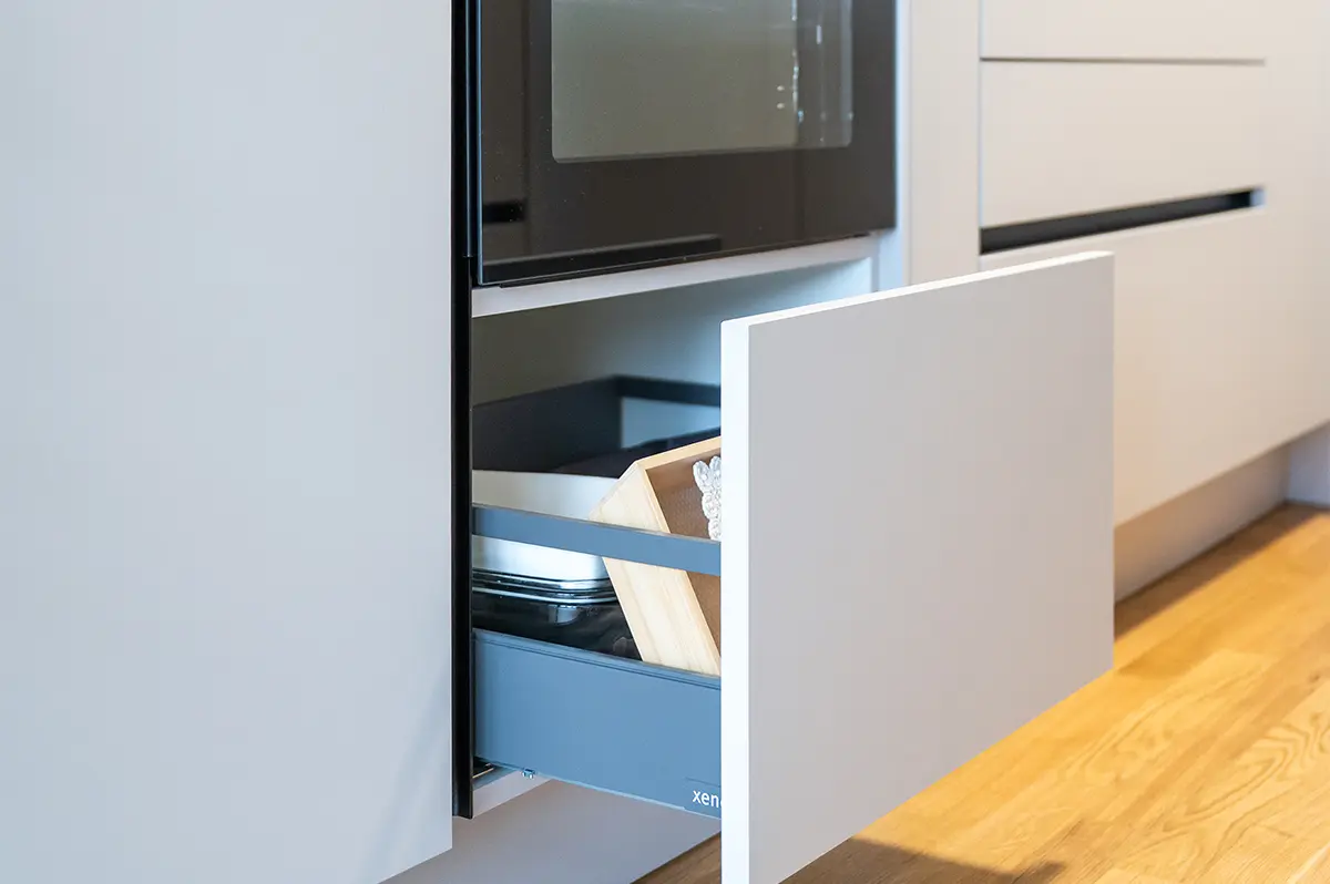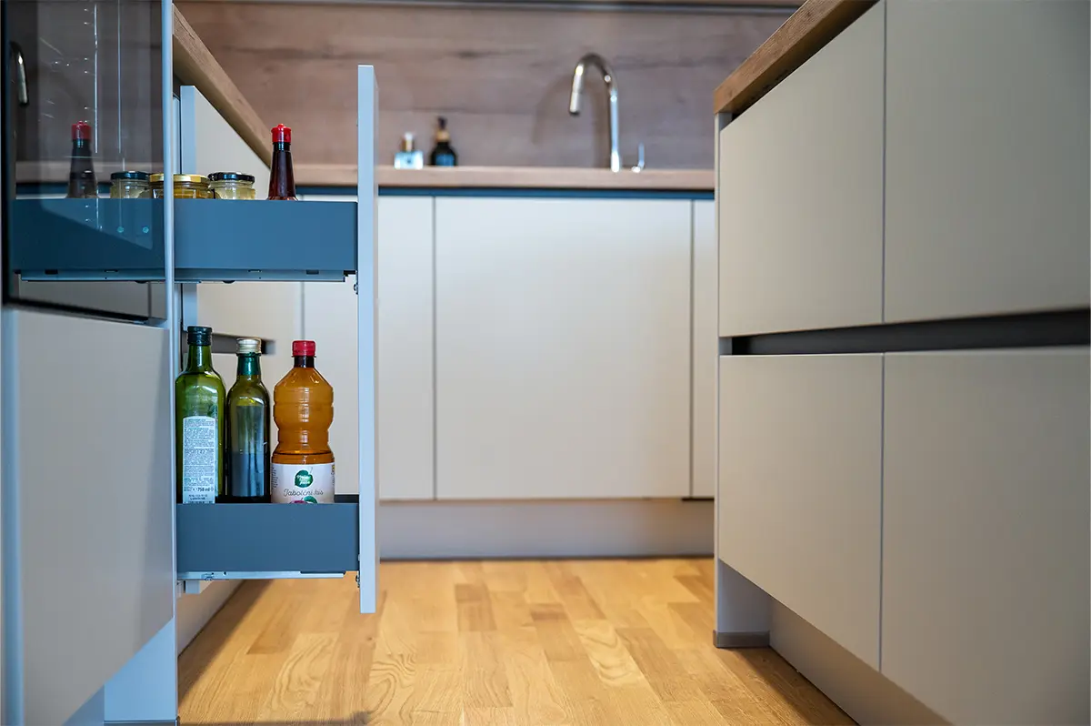 Posebno pozornost smo namenili shranjevalnim rešitvam; izvlečni elementi, globoki predali in pametna notranja oprema omogočajo optimalen izkoristek prostora ter vsakodnevno udobje.