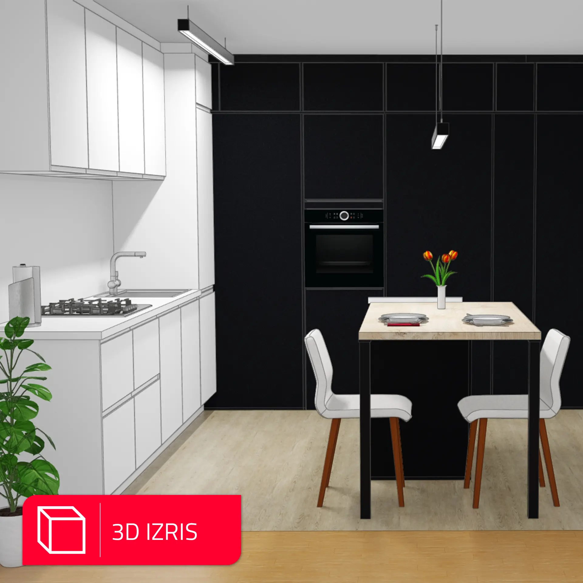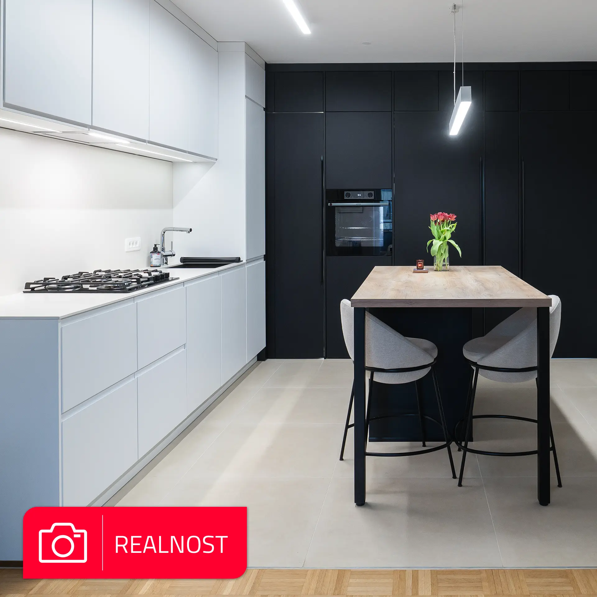 Kuhinja je zasnovana v sodobni črno-beli kombinaciji z toplim dodatkom lesa. Zlitje z dnevnim prostorom je bilo ključni cilj, zato je celoten volumen kuhinje skrbno integriran v prostor.