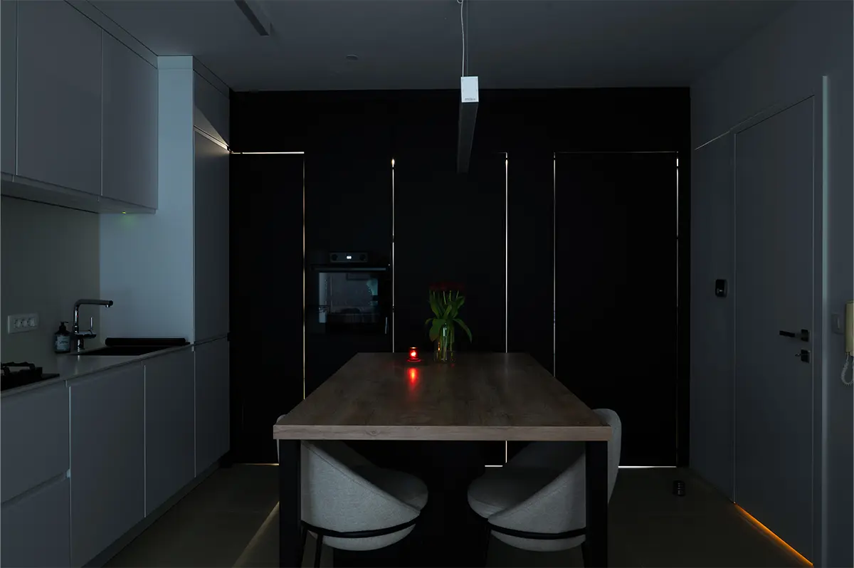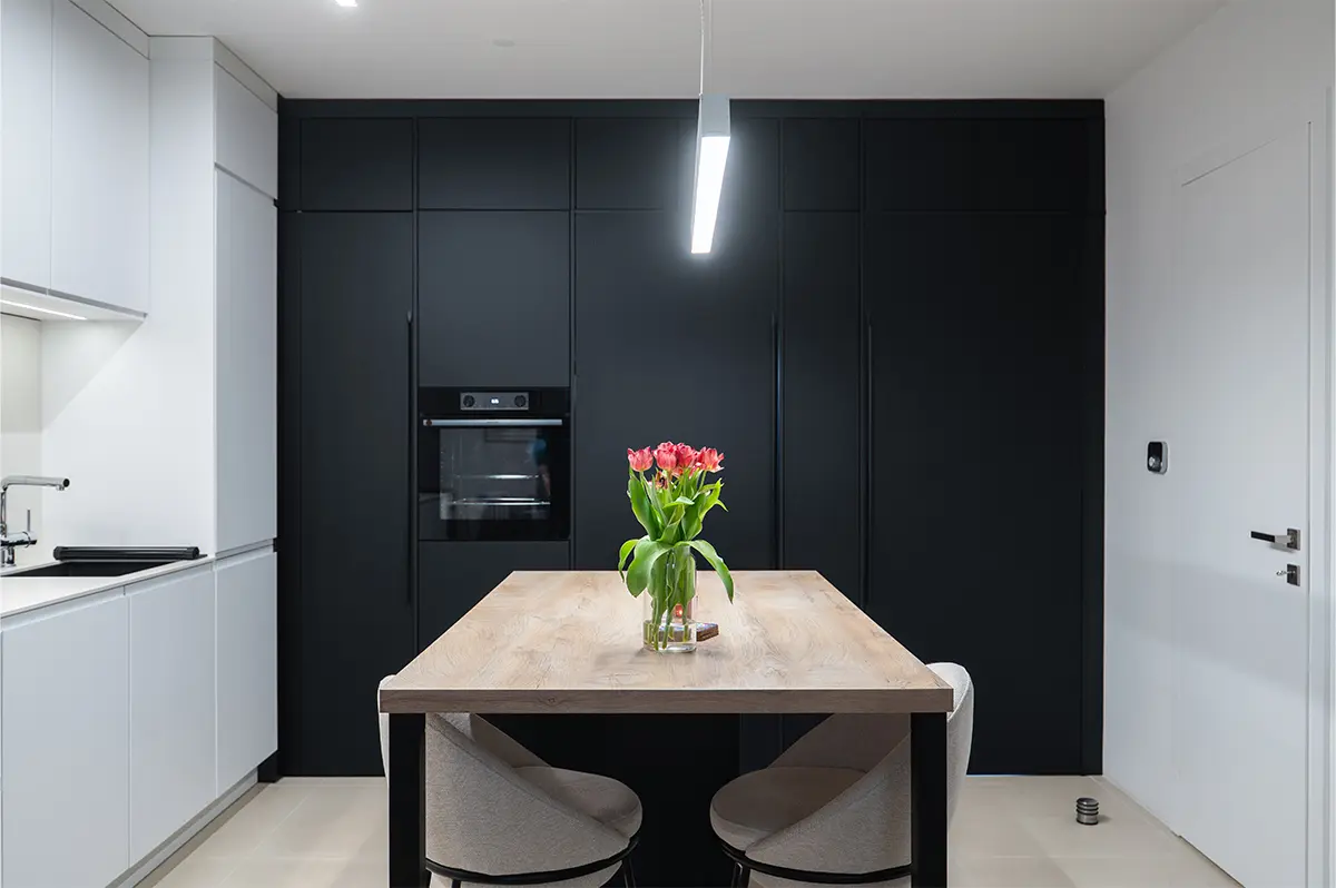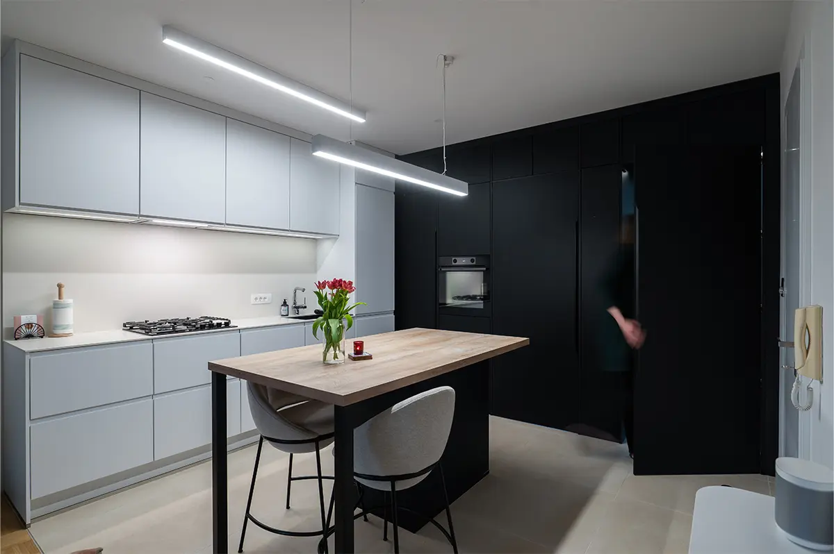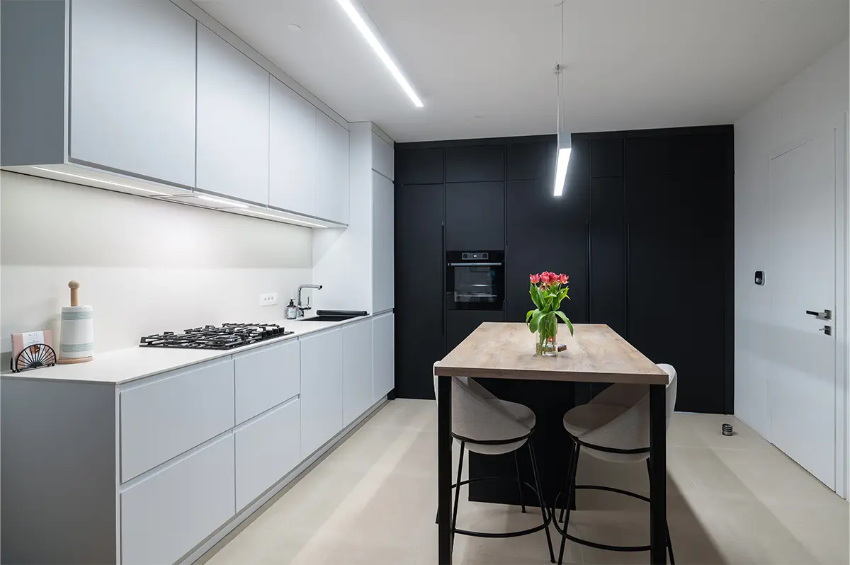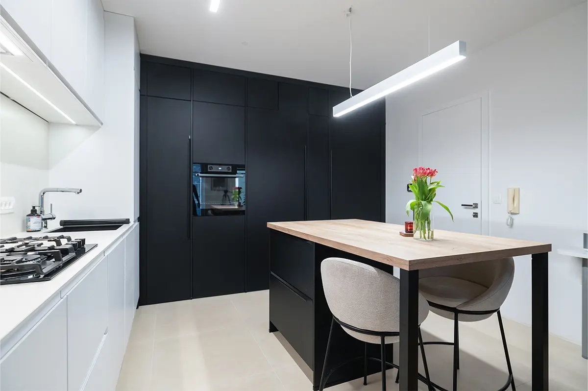 Kuhinja je zasnovana v sodobni črno-beli kombinaciji z toplim dodatkom lesa. Zlitje z dnevnim prostorom je bilo ključni cilj, zato je celoten volumen kuhinje skrbno integriran v prostor.
