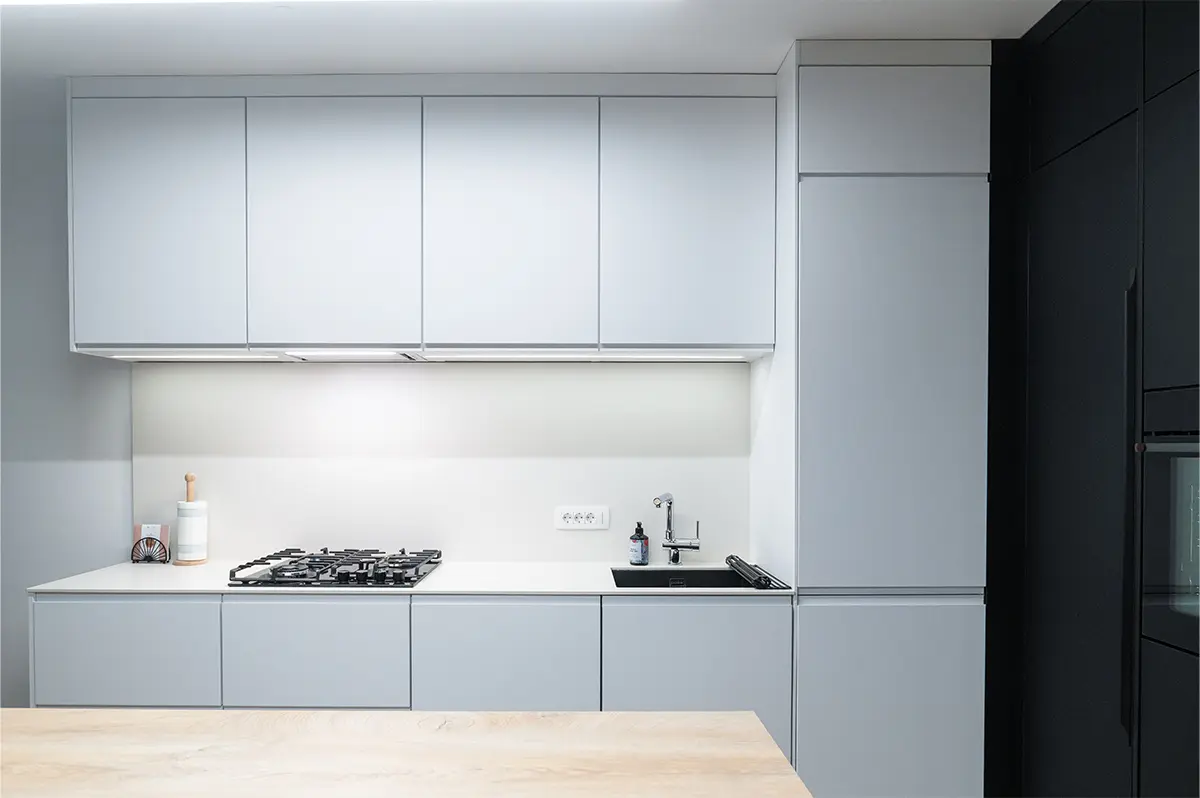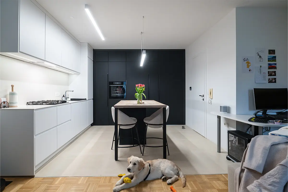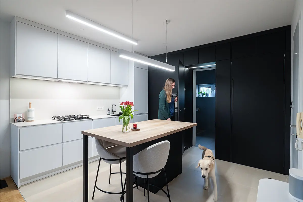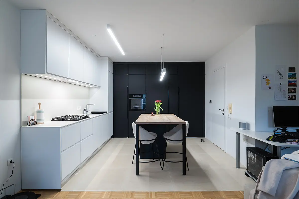 Stanovanje je bilo prej enosobno, zdaj je dvosobno, zato je bilo treba res temeljito razmisliti o vsakem detajlu, da smo izkoristili prostor maksimalno. Dodali smo delovne površine, več shranjevalnih možnosti in funkcionalne prehode, ki jih prej ni bilo.