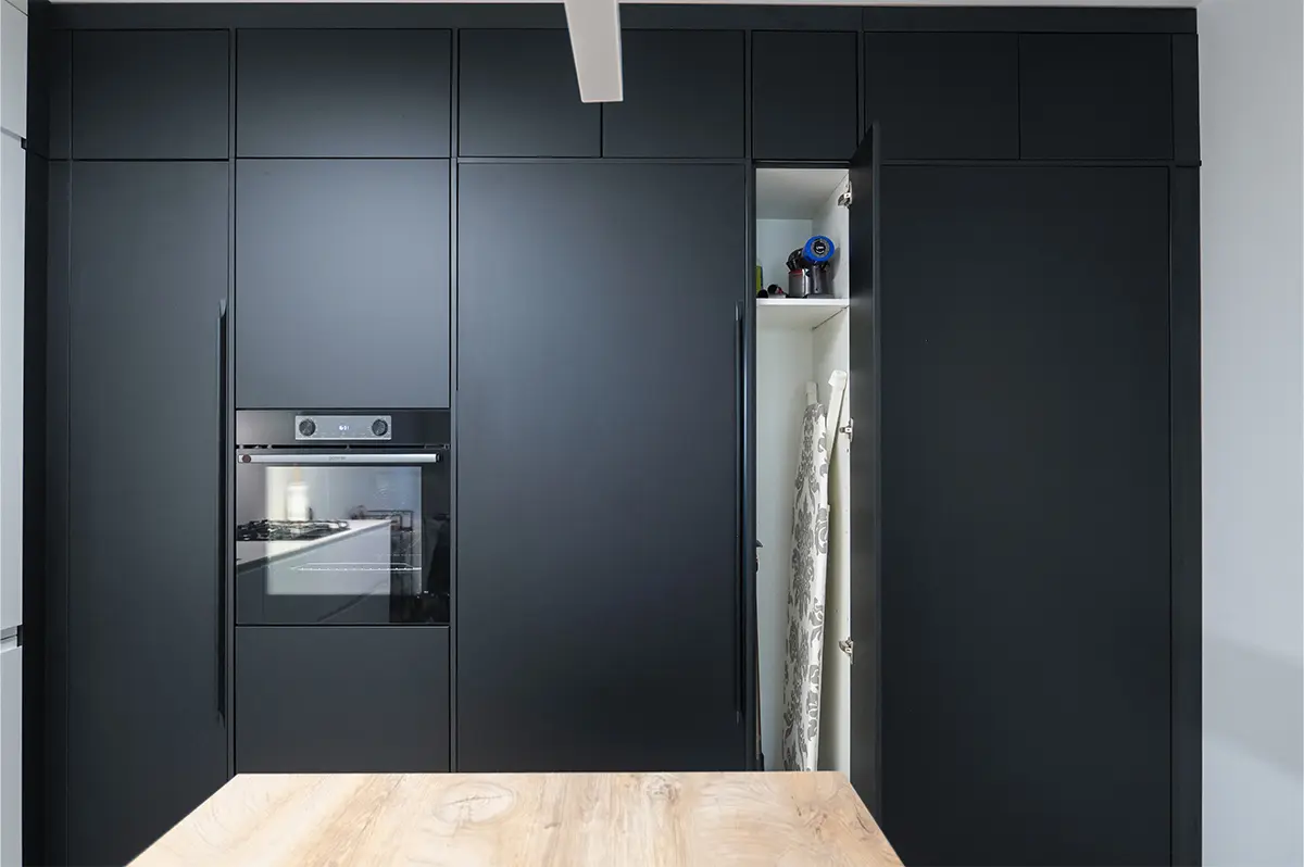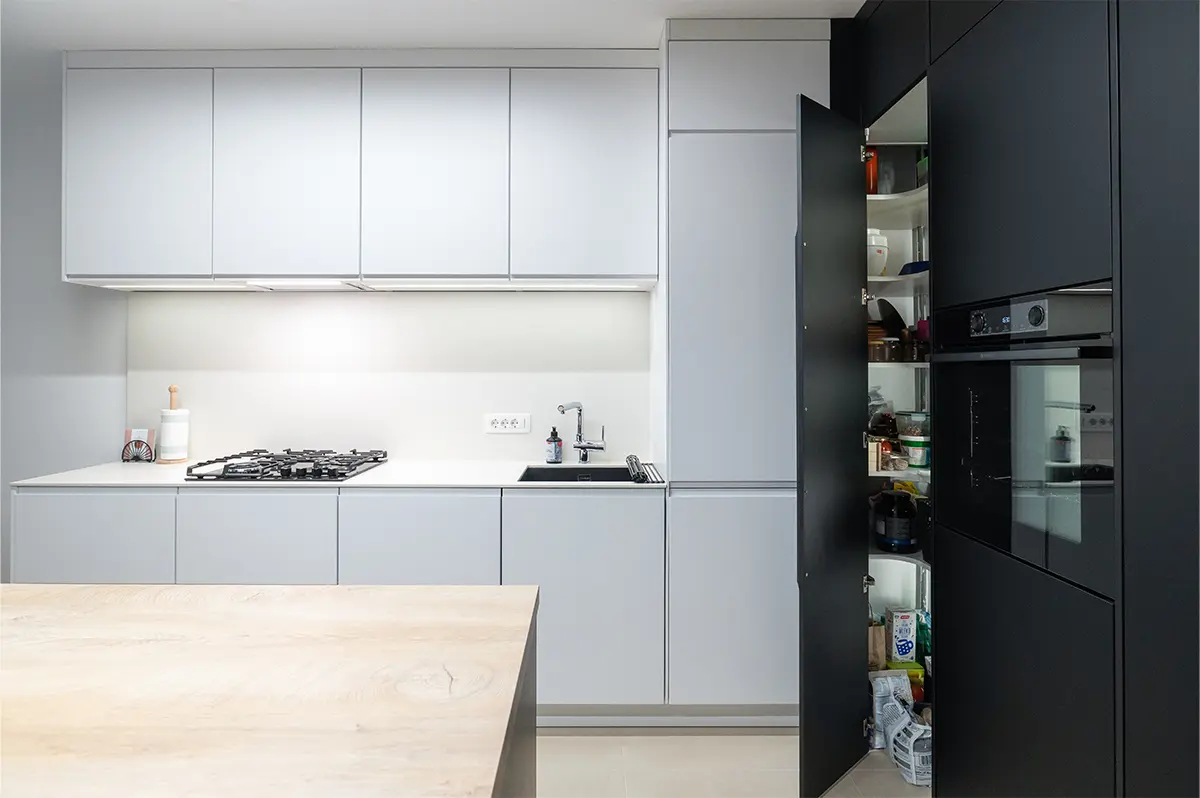 Ta kuhinja je odličen primer premišljenega načrtovanja in natančne izvedbe, kjer se estetska dovršenost sreča z visoko stopnjo funkcionalnosti – tudi v omejenem tlorisu.