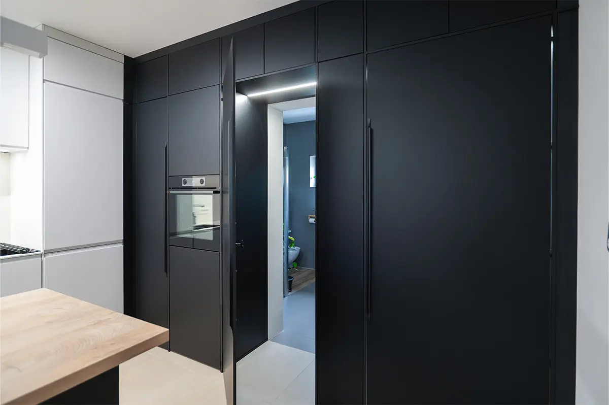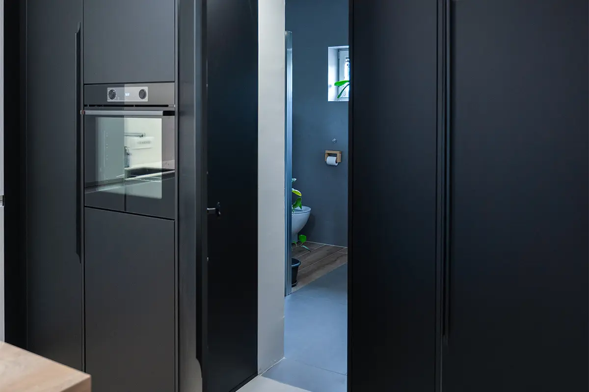 Da, ena glavnih prilagoditev je bila preureditev tlorisa. Prej smo do kopalnice hodili skozi spalnico, kar je bilo zelo nepraktično. Arhitektka je že na prvem sestanku predlagala preboj stene in postavitev skritih notranjih vrat – danes imamo prehod v kopalnico kar skozi kuhinjo, kar je veliko bolj funkcionalno. Z dodatkom LED osvetlitve je prostor postal še bolj prijeten, še posebej ponoči.